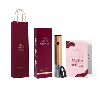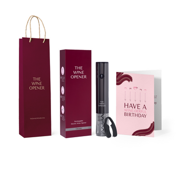 This birthday bundle is a the perfect surprise for the wine lover in your life. It includes our iconic Electric Wine Opener in either chrome or gold, and comes with a free birthday card and a elegant gift bag, making it the perfect present for their special day. Add a personal touch with custom engraving to make this gift uniquely theirs.